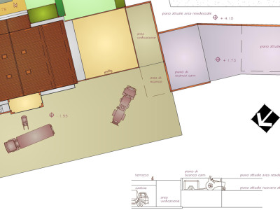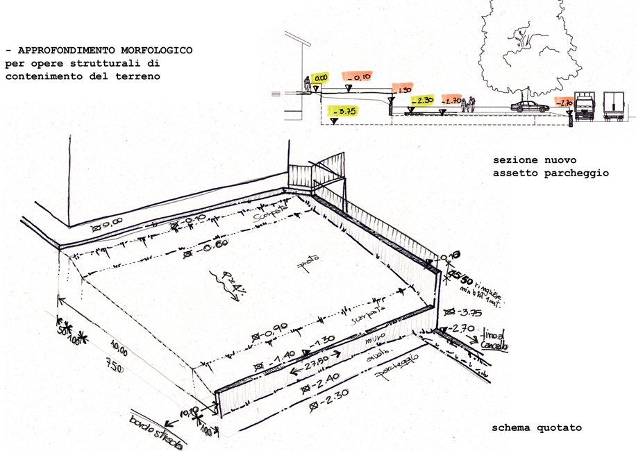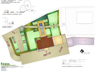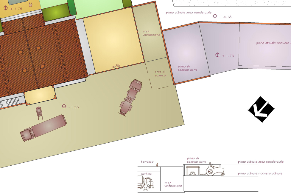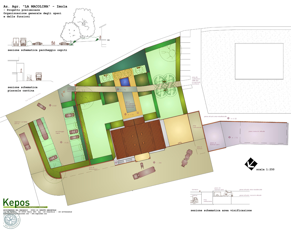 il progetto preliminare per la sistemazione paesaggistica delle aree di pertinenza dell’azienda vitivinicola si è concentrato, in particolare, sui seguenti ambiti: Giardino di rappresentanza; Parcheggio e ingresso; Viabilità di servizio alla cantina. Inoltre si è proceduto ad un approfondimento sulle opere strutturali di contenimento del terreno.