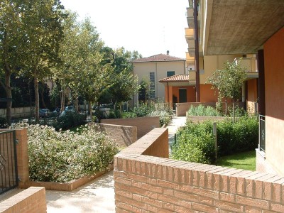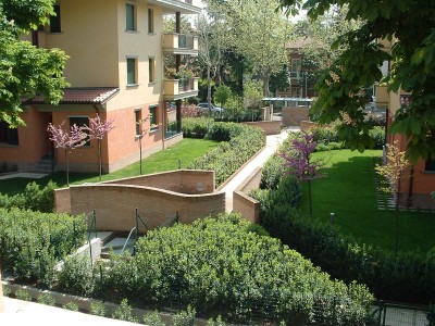 La sistemazione paesagisstica degli spazi esterni comuni a due condomini ha avuto una duplice funzione.
