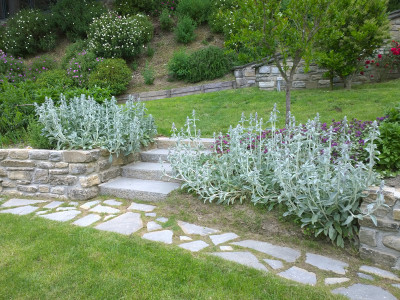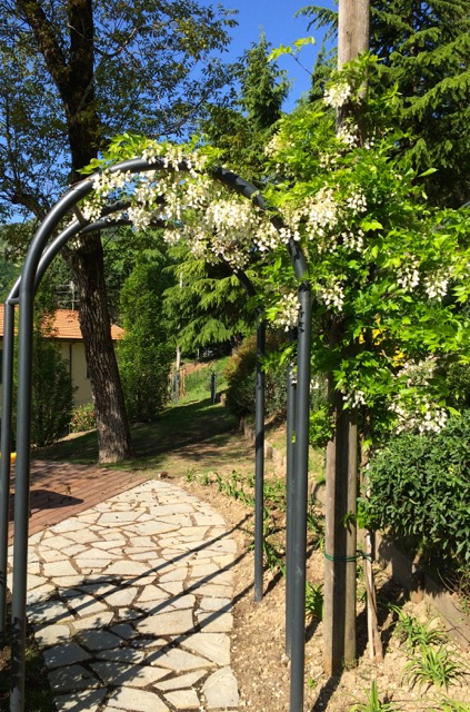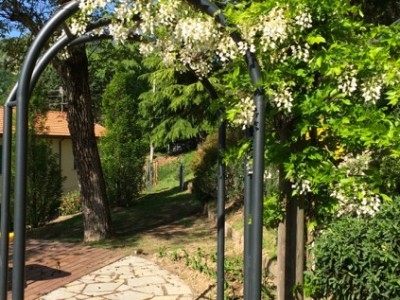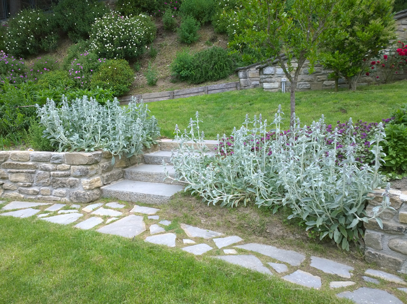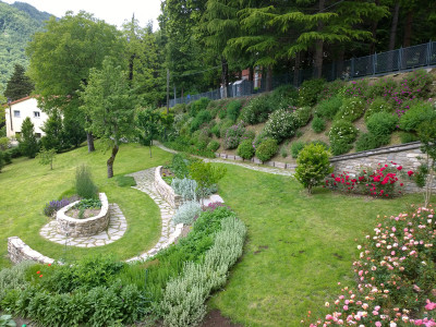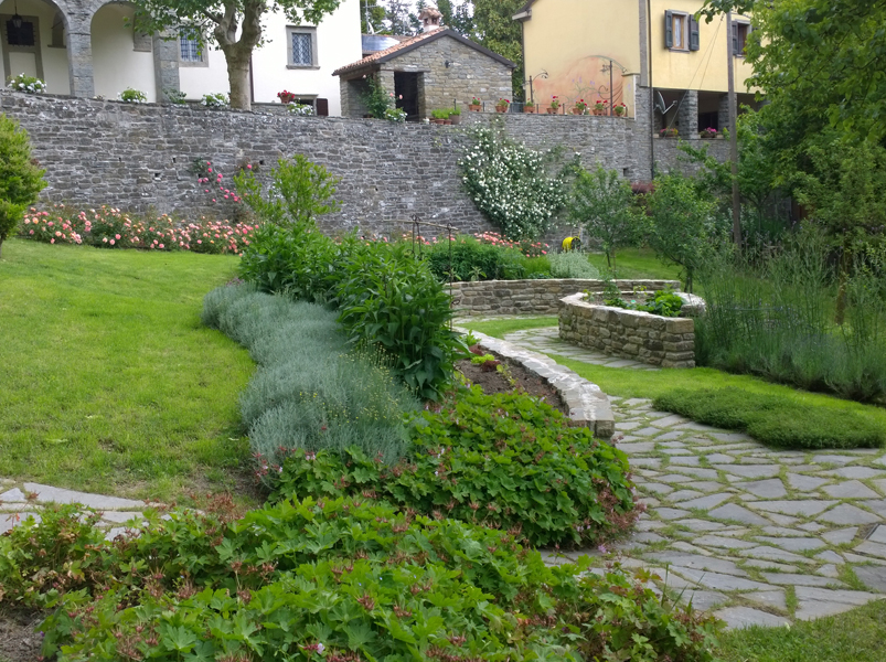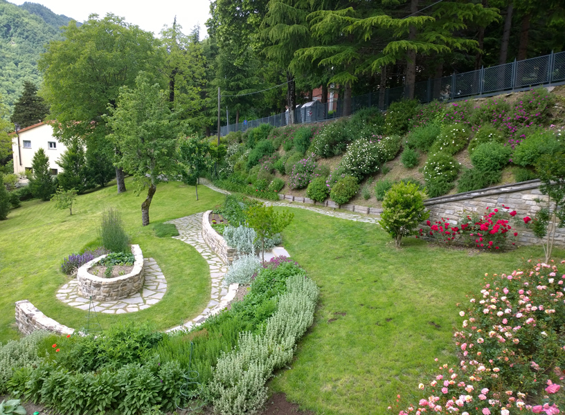 Il progetto ha cercato di integrare le preesistenze arboree, Melograno, Pero, Noci all’andamento scosceso del terreno per ricavare spazi comodamente coltivabili. Attraverso l’uso della linea curva, caratteristica imprescindibile richiesta espressamente dalla committenza, sono stati realizzati piccoli muretti di contenimento per coltivare aromatiche ed ortaggi insieme ad erbacee e piccoli arbusti. Il sentiero che costeggia la scarpata di confine, passando attraverso il Portale del Glicine, porta ad un più intimo salottino all’aperto all’ombra dei Noci, con vista sulle colline circostanti.