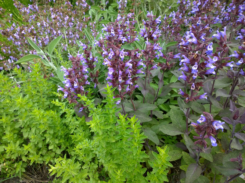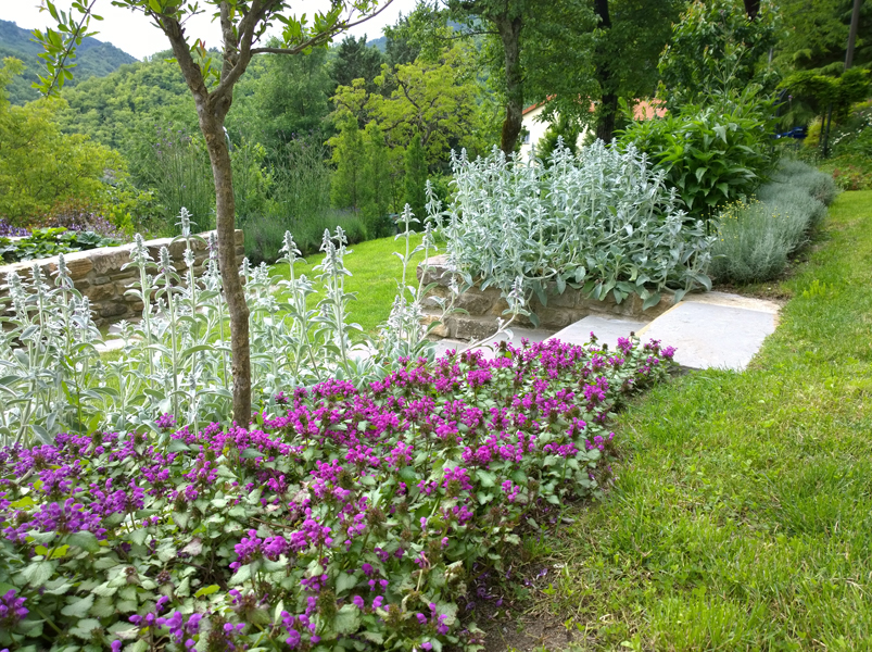 L’idea è stata quella di creare aiuole miste con giochi di altezze, senza un davanti e un dietro ma da scoprire secondo punti di vista diversi. La varietà della vegetazione e le copiose fioriture attrarranno insetti utili impollinatori anche per l’orto. La vegetazione è composta perlopiù da erbacee perenni ma il bordo dell’aiuola, non definito dal muretto, è reso più forte da bordure di arbusti o erbacee sempreverdi. Questo permette di mantenere meglio anche nel tempo la struttura e il disegno.