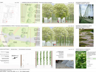 La nostra soluzione ha privilegiato una soluzione in cui la barriera crea il minor impatto visivo nel contesto generale senza alterare il disegno del verde e lo spazio formale pensato in origine. Infatti la barriera visiva è costituita da “archi verdi” che morbidamente si insinuano tra i filari alberati, andando a costituire un filtro che, anziché sottolineare e ribadire la rigidità del confine, crea nuove prospettivei.