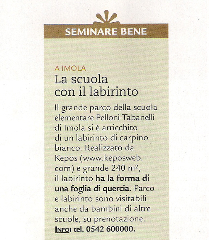 Sul numero di Gennaio 2013 è stata pubblicata la notizia della realizzazione del Labirinto delle Querce alla scuola primaria Pelloni-Tabanelli di Imola