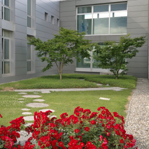 Il giardino aziendale è stato sviluppato partendo da un’idea progettuale che ha privilegiato gli aspetti scenografici e il dialogo con l’architettura. A questo scopo il progetto paesaggistico ha coniugato il disegno circolare dell’ingresso principale alla palazzina uffici con la forma del cerchio presente in molti elementi della produzione industriale della FEMI S.p.A.